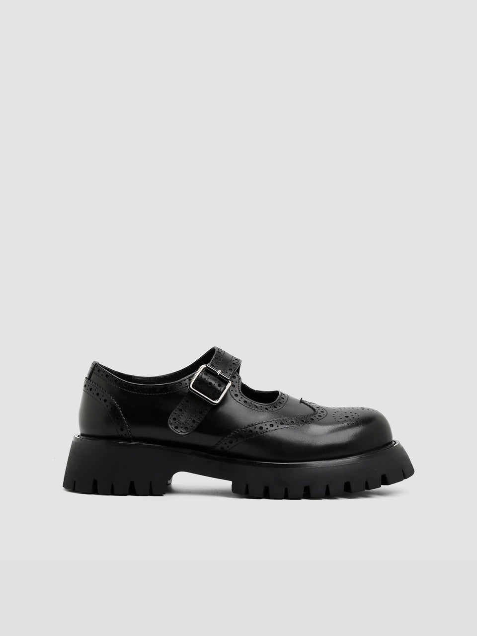 Frank Allison is a bold single-strap Mary Jane in sleek black, featuring wingtip and brogue detailing, elevated with platform soles for a perfect blend of classic charm and modern edge.